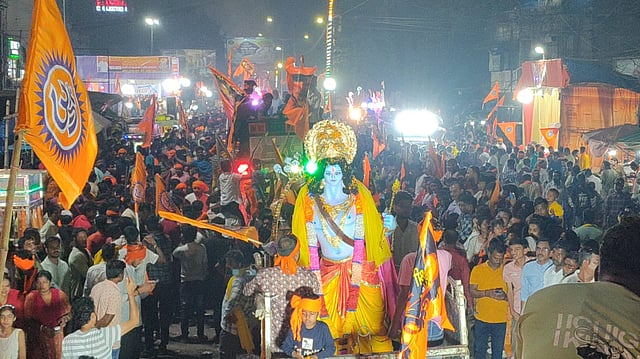 आसनसोल : रामनवमी के उपलक्ष्य पर रविवार शाम आसनसोल शहर में विशाल जुलूस निकाला गया। शहर के अलग-अलग इलाकों से करीब 40 कमेटियों ने जुलूस निकाले और जीटी रोड पहुंचे। गौरतलब है कि जीटी रोड पर निकली इस शोभायात्रा में शहर के अखाड़ों ने हिस्सा लिया, जहां प्रतिभागियों ने हैरतअंगेज करतब दिखाकर लोगों का मन मोह लिया। शोभायात्रा में विभिन्न प्रकार की आकर्षक झांकियां प्रस्तुत की गयीं। कई श्रद्धालु भगवान श्रीराम, हनुमान और अन्य देवी-देवताओं के वेश में नजर आये, जिससे पूरा वातावरण भक्तिमय हो उठा। साथ ही जय श्रीराम के जयघोष से पूरा इलाका गूंज उठा और माहौल पूरी तरह से राममय हो गया। इस अवसर पर आसनसोल बाजार कमेटी, महावीर स्थान सेवा समिति, श्रीश्री गणेश पूजा कमेटी एवं विभिन्न सामाजिक और धार्मिक संगठनों द्वारा जगह-जगह सेवा शिविर लगाए गए थे, जहां शोभायात्रा में शामिल श्रद्धालुओं के लिए पानी, प्रसाद और अन्य सुविधाओं की व्यवस्था की गई थी। इस भव्य आयोजन में तृणमूल प्रत्याशी मलय घटक, भाजपा प्रत्याशी कृष्णेंदु मुखर्जी, आसनसोल नगर निगम के चेयरमैन अमरनाथ चटर्जी, एमएमआईसी गुरदास चटर्जी, बोरो चेयरमैन राजेश तिवारी, आसनसोल बाजार कमेटी के सचिव पिंटू गुप्ता, संजय तिवारी, पवन गुटगुटिया, महावीर स्थान सेवा समिति के अरुण शर्मा, विजय शर्मा, सियाराम अग्रवाल, एसीपी सेंट्रल एमडी गफ्फार, साउथ थाना के आईसी विश्वजीत हलदार आदि उपस्थित थे तथा काफी संख्या में सेंट्रल फोर्स के जवान भी तैनात थे।