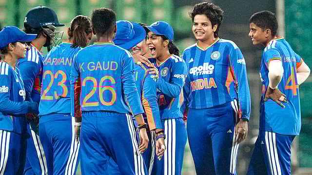 सलामी बल्लेबाज स्मृति मंधाना और शेफाली वर्मा ने तूफानी बल्लेबाजी की। शेफाली वर्मा ने सीरीज में लगातार तीसरी फिफ्टी लगाई। वे 79 रन (12 चौके, 1 छक्का) बनाकर आउट हुईं। वहीं मंधाना ने 35 गेंद में फिफ्टी पूरी की और 80 रन (11 चौके, 3 छक्के) बनाकर पवेलियन लौटीं। ऋचा घोष ने 16 गेंद पर नाबाद 40 और कप्तान हरमनप्रीत कौर ने 10 गेंद पर 16 रन बनाकर नाबाद रहीं।