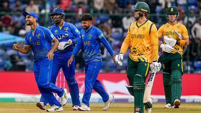 नयी दिल्ली : कोर्बिन बॉश की अगुवाई में अपने गेंदबाजों के अनुशासित प्रदर्शन के दम पर दक्षिण अफ्रीका ने T-20 विश्व कप के अपने आखिरी ग्रुप लीग मैच में बुधवार को संयुक्त अरब अमीरात को छह विकेट से हराकर सुपर आठ की तैयारी पुख्ता कर ली। पिछली उपविजेता दक्षिण अफ्रीका को सुपर आठ चरण के पहले मैच में 22 फरवरी को अहमदाबाद में मौजूदा चैंपियन और मेजबान भारतीय टीम से खेलना है। वहीं UAE की टीम ने इस हार के साथ टूर्नामेंट से विदा ली। हल्की बूंदाबांदी और ठंडे मौसम के बीच भारतीय टीम का मैच नहीं होने के बावजूद अरूण जेटली स्टेडियम पर 12000 से अधिक दर्शक यह मैच देखने मौजूद थे ।