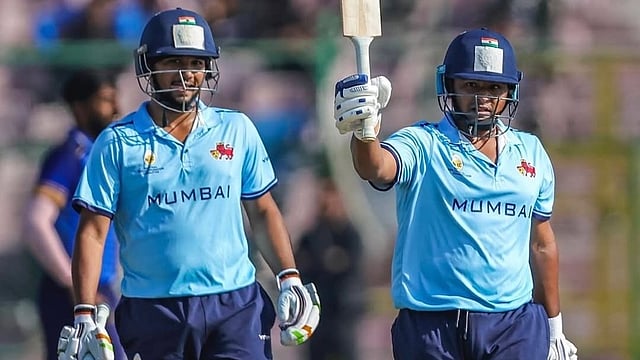 जयपुर : सरफराज खान ने बुधवार को यहां 75 गेंद में 14 छक्कों की मदद से 157 रन की विस्फोटक पारी खेलकर 2025 का अंत शानदार अंदाज में किया जिसकी बदौलत मुंबई की टीम विजय हजारे ट्रॉफी के ग्रुप सी मुकाबले में गोवा को 87 रन से हराकर नॉकआउट चरण के करीब पहुंच गई। सैयद मुश्ताक अली ट्रॉफी में भी शानदार फॉर्म में रहे सरफराज ने 56 गेंद में शतक पूरा किया जो उनका लिस्ट ए क्रिकेट में तीसरा शतक था। मुंबई ने इसकी मदद से आठ विकेट पर 444 रन का विशाल स्कोर खड़ा किया और फिर गोवा को नौ विकेट पर 357 रन पर रोक दिया। यह ग्रुप लीग में मुंबई की लगातार चौथी जीत है। अब बचे हुए तीन मैच में से एक और जीत उसे निश्चित रूप से क्वार्टर-फाइनल में पहुंचा देगी।