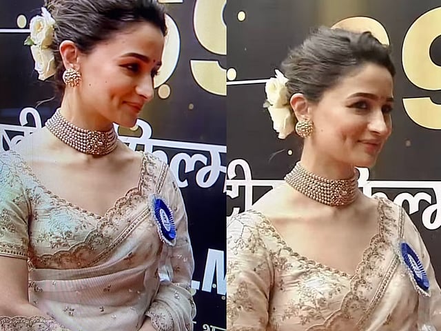 आलिया के लुक की बात करें तो उन्होंने ऑफ व्हाइट कलर की साड़ी कैरी की है। ये साड़ी उन्होंने अपनी शादी में पहनी थी। इस साड़ी को सब्यसाची ने डिजाइन किया था। नेशनल अवॉर्ड लेने पहुंचीं आलिया ने इस लुक को चोकर नेकलेस और स्टड ईयररिंग के साथ कंप्लीट किया है। उन्होंने लाल बिंदी लगाई थी, जो उनके लुक को कॉम्प्लीमेंट कर रही थी। आलिया ने अपने बालों में सफेद गुलाब भी लगाए हैं, जिससे उनका लुक निखरकर आ रहा है। आलिया पूरे लुक में बेहद गॉर्जियस लग रही हैं। इस इवेंट में आलिया अपने पति रणबीर कपूर के साथ पहुंची हैं। रणबीर कपूर इस इवेंट में ब्लैक कलर के आउट फिट में नजर आए। ब्लैक शेड्स में वो बेहद हैंडसम लग रहे थे।