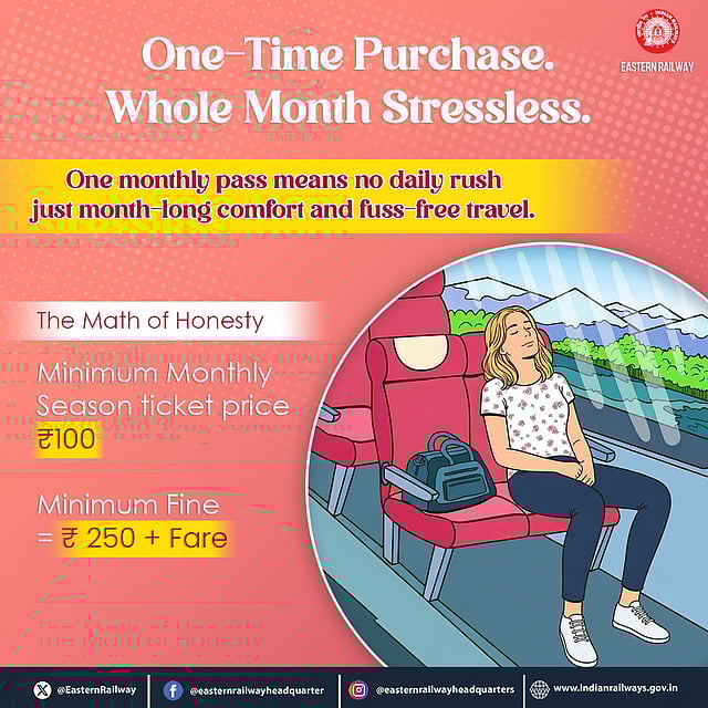 मासिक टिकट सस्ता, जुर्माना महंगा : प्रशासन ने आंकड़ों के जरिए समझाया कि नियमित यात्री के लिए मासिक सीजन टिकट (MST) लेना अधिक लाभकारी है। सियालदह–नैहाटी या हावड़ा–बंडेल सेक्शन के लिए मासिक सीजन टिकट की कीमत केवल 185 रुपये है, जिससे पूरे महीने असीमित यात्रा की जा सकती है। इसके विपरीत, यदि कोई यात्री बिना टिकट पकड़ा जाता है तो उसे न्यूनतम 260 रुपये (किराया व जुर्माना सहित) का दंड देना पड़ता है। यानी एक बार की गलती का जुर्माना पूरे महीने के वैध सफर से भी अधिक है।