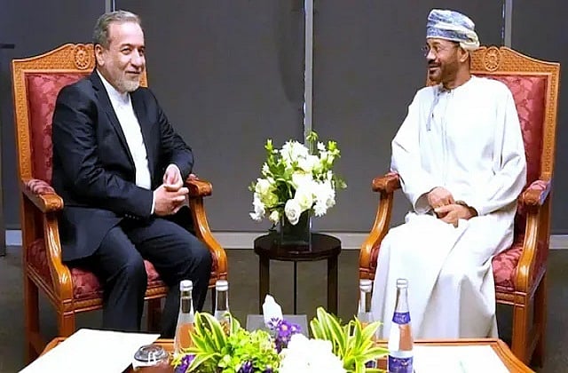 ईरानी विदेश मंत्री अब्बास अराघची (बाएं) अपने ओमानी समकक्ष सैय्यद बद्र अलबुसैदी से मस्कट, ओमान में अमेरिकी मध्यपूर्व दूत स्टीव विटकॉफ के साथ वार्ता से पहले मिलते हुए।