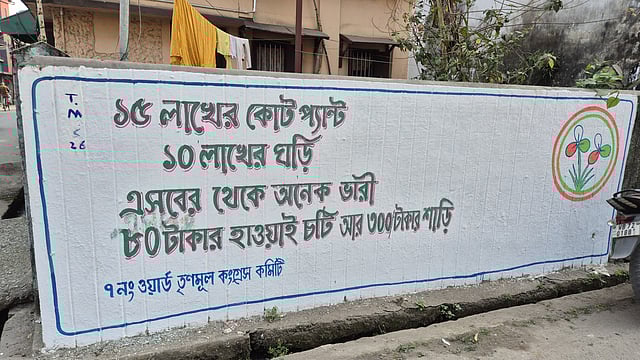 जलपाईगुड़ी: दीवार पर लिखने को लेकर राजनीतिक लड़ाई शुरू हो गई है। वहीं तृणमूल ने पहले ही दीवारों पर व्यंग्यात्मक भाषा में लिखना शुरू कर दिया है। इसमें तृणमूल ने जलपाईगुड़ी शहर के वार्ड नंबर 7 में एक दीवार पर देश के प्रधानमंत्री नरेंद्र मोदी के कपड़ों की तुलना राज्य की मुख्यमंत्री ममता बनर्जी के कपड़ों से करते हुए लिखा है। तृणमूल ने दीवार पर लिखा है, "15 लाख का कोट पैंट, 10 लाख की घड़ी, इनसे कहीं ज़्यादा भारी, 80 रुपये की हवाईयन और 300 रुपये की साड़ी। जलपाईगुड़ी नगरपालिका की पूर्व चेयरपर्सन पापिया पाल के वार्ड में दीवार पर इसी भाषा में लिखा गया है। पापिया पाल ने कहा कि सब जानते हैं कि हमारी पार्टी के नेता और मुख्यमंत्री आम लोगों की तरह रहती हैं। लेकिन जब लोग देश के प्रधानमंत्री के कपड़े देखते हैं तो क्या सोचते हैं? यही तुलना का अंतर सामने आया है। BJP या किसी दूसरी पार्टी ने अभी तक तृणमूल की तरह व्यंग्यात्मक भाषा में दीवारों पर लिखना शुरू नहीं किया है। BJP के जलपाईगुड़ी नेता श्याम प्रसाद ने कहा,इस दीवार लेखन से उन लोगों पर कोई असर नहीं पड़ेगा जो तृणमूल नेताओं के भ्रष्टाचार के बारे में नीचे से लेकर ऊपर तक जानते हैं।