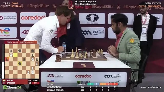 दोहा : विश्व के नंबर एक खिलाड़ी मैग्नस कार्लसन ने एक भारतीय खिलाड़ी से हारने के बाद फिर से अपना आपा खोया और मेज पर मुक्का मार दिया। कतर की राजधानी दोहा में चल रही वर्ल्ड रैपिड/ब्लिट्ज चैंपियनशिप में भारत के शीर्ष ग्रैंडमास्टर अर्जुन एरिगैसी ने अपने मजबूत एंडगेम और त्वरित गणना करने के कौशल का शानदार नमूना पेश करते हुए विश्व के नंबर एक खिलाड़ी मैग्नस कार्लसन को हराकर विश्व ब्लिट्ज शतरंज चैंपियनशिप के पहले दिन संयुक्त बढ़त हासिल की। इसके बाद एरिगैसी ने एक अन्य शीर्ष ग्रैंडमास्टर नोदिरबेक अब्दुसत्तोरोव को भी हराया और तीन अन्य गेम ड्रॉ किए।