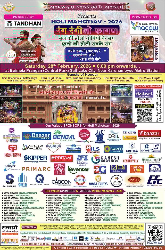 कोलकाता : आज शाम सेंट्रल पार्क में होगा वृंदावन के विश्वप्रसिद्ध श्रीबांके बिहारी जी मंदिर की प्रतिकृति पर निर्मित प्रांगण में राग-रंग-रस भरा होली महोत्सव। पहली बार सुप्रसिद्ध ध्रुव शर्मा व स्वर्णा श्री (वृंदावन) अपने सुमधुर स्वर से होली के गीतों की रसवर्षा करेंगे।