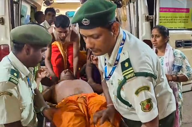 भगदड़ में घायल श्रद्धालुओं को अस्पताल ले जाते पुलिसकर्मी