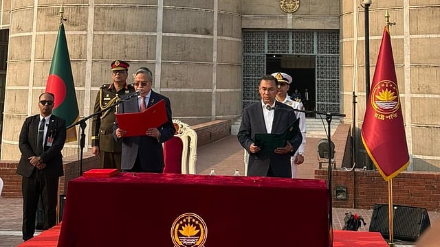 ढाकाः तारिक रहमान ने मंगलवार को बांग्लादेश के प्रधानमंत्री पद की शपथ ली। कुछ ही दिन पहले उन्होंने बांग्लादेश नेशनलिस्ट पार्टी (बीएनपी) को आम चुनावों में शानदार जीत दिलाई थी।राष्ट्रपति मोहम्मद शहाबुद्दीन ने रहमान (60) को बंगभवन के बजाय जातीय संसद के ‘साउथ प्लाजा’ में पद की शपथ दिलाई और ऐसा परंपरा से हटकर किया गया।