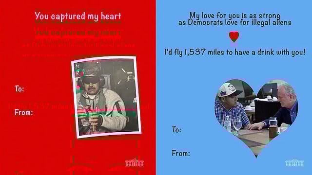 तीसरे कार्ड में डेमोक्रेटिक सीनेटर क्रिस वैन होलेन को एल साल्वाडोर में MS-13 गैंग के कथित सदस्य किल्मर एब्रेगो गार्सिया के साथ मार्गरिटा पीते हुए दिखाया गया है। कार्ड पर लिखा है, "मेरा प्यार आपके लिए उतना ही मज़बूत है जितना डेमोक्रेट्स का गैर-कानूनी विदेशियों के लिए प्यार। मैं आपके साथ ड्रिंक करने के लिए 1,537 मील उड़कर जा सकता हूँ।"