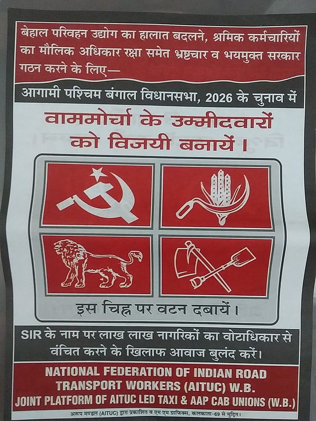 कोलकाता: पश्चिम बंगाल विधानसभा चुनाव 2026 के मद्देनजर परिवहन क्षेत्र के श्रमिकों ने अपनी ताकत झोंक दी है। AITUC (ऑल इंडिया ट्रेड यूनियन कांग्रेस) से जुड़ी परिवहन क्षेत्र की यूनियनों ने वाम मोर्चा (Left Front) के उम्मीदवारों के समर्थन में एक व्यापक अभियान चलाने का निर्णय लिया है। यह महाभियान शनिवार, 18 अप्रैल 2026 को सियालदह स्थित रिलायंस मार्केट के पास से शाम 4 बजे शुरू होगा।