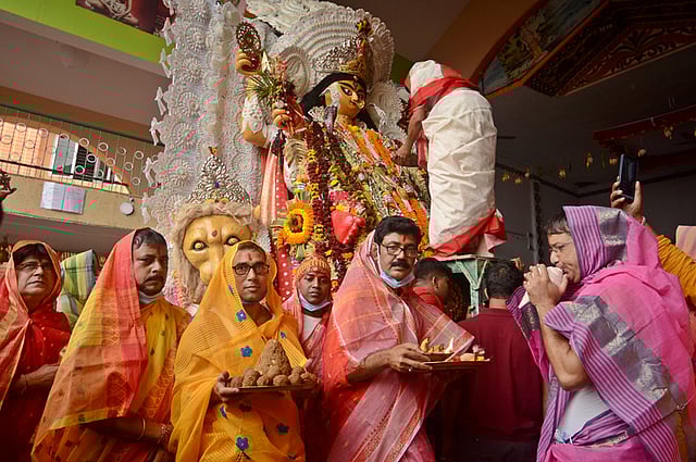 वे विवाहित स्त्रियों की तरह साड़ी पहनकर, सिन्दूर लगाकर, शंख-चूड़ी पहनकर और घूंघट ओढ़कर देवी का वरण करने लगे। सदियों से यह परंपरा अब भी उतनी ही श्रद्धा के साथ निभायी जाती है। दशमी के दिन, जब प्रतिमा विसर्जन से पहले ‘माँ’ का वरण होता है, तो पुरुष पारंपरिक स्त्री-वेश में सजकर कनकांजलि अर्पित करते हैं।