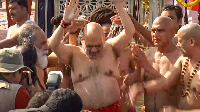 प्रयागराज : केंद्रीय गृह एवं सहकारिता मंत्री अमित शाह ने सोमवार को प्रयागराज महाकुंभ में पहुंचकर संगम में संतों के मंत्रोच्चार के बीच आस्था की डुबकी लगाई। उनके साथ उत्तर प्रदेश के मुख्यमंत्री योगी आदित्यनाथ भी थे। केंद्रीय गृह मंत्री शाह सोमवार को महाकुंभ के पवित्र स्नान के लिए त्रिवेणी संगम पहुंचे। इससे पहले प्रयागराज पहुंचने पर शाह का हवाई अड्डे पर स्वागत उत्तर प्रदेश के मुख्यमंत्री योगी आदित्यनाथ, उप्र के उपमुख्यमंत्री केशव प्रसाद मौर्य और ब्रजेश पाठक ने किया। भाजपा की राज्य इकाई के प्रमुख भूपेंद्र चौधरी सहित पार्टी के अन्य नेताओं ने भी हवाई अड्डे पर शाह का स्वागत किया। दोपहर करीब 12 बजे शाह गंगा, यमुना और पौराणिक सरस्वती के संगम पर अरैल स्थित वीआईपी घाट पहुंचे।