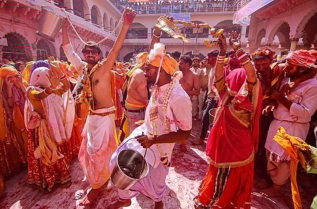 मथुरा : कृष्ण की नगरी मथुरा के बलदेव शहर के ऐतिहासिक श्री दाऊजी मंदिर में बृहस्पतिवार को पारंपरिक ‘हुरंगा’ का आयोजन भक्ति और चटकीले रंगों से सराबोर दिखा। इसमें विदेशी पर्यटकों की भी मौजूदगी रही। लोक मान्यता के अनुसार, हुरंगा देवर और भाभी के बीच के रिश्ते का सम्मान करने के लिए मनाया जाता है।